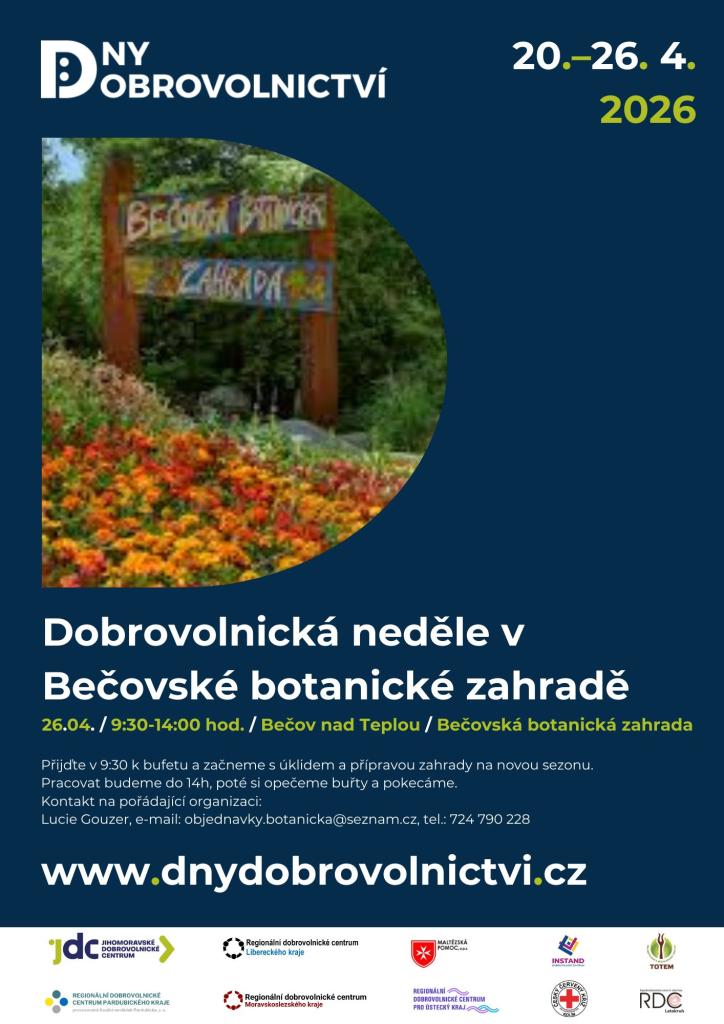 Dobrovolnická neděle se koná 26. dubna 2026 od 9:30 do 14:00 hodin v Bečovské botanické zahradě. Na akci se můžete těšit na úklid a přípravu zahrady na novou sezonu.